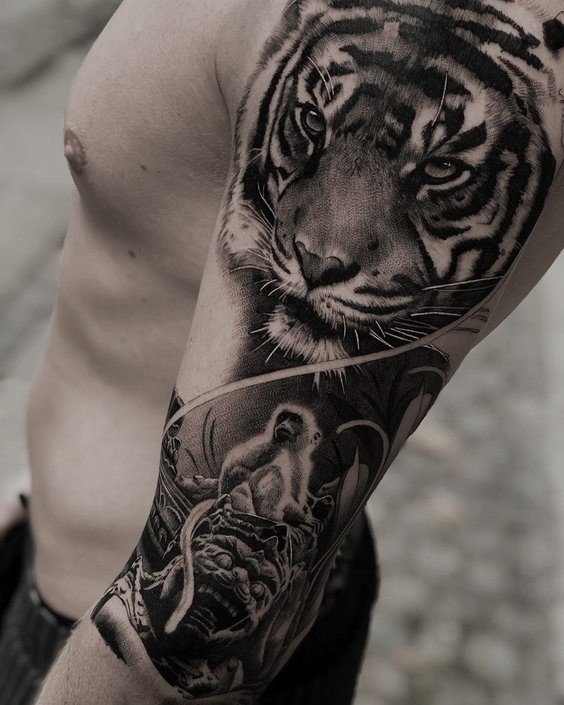 Realistické tetovanie tigra sa môže líšiť veľkosťou, umiestnením a štýlom. Majú však vždy rovnaký cieľ - vytvoriť tvár majestátnej dravej šelmy. Tieto tetovania sú dosť zložité a podrobné. Predvedú každý pruh, fúz, srsť a sval zvieraťa, a to v dobrej kvalite, a preto vyžadujú veľa času a trpezlivosti.