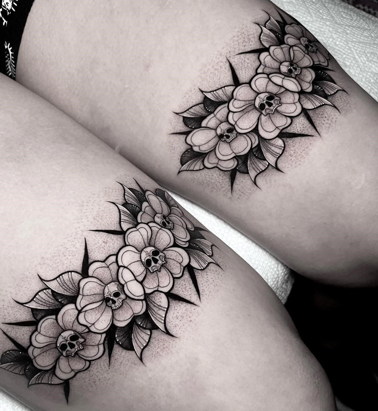 - Kvety: Kvety v kombinácii s lebkou môžu symbolizovať krásu, nehu a život. Je to dodatočný dôraz na interakciu života a smrti, čo naznačuje, že aj v najtemnejších chvíľach je krása.