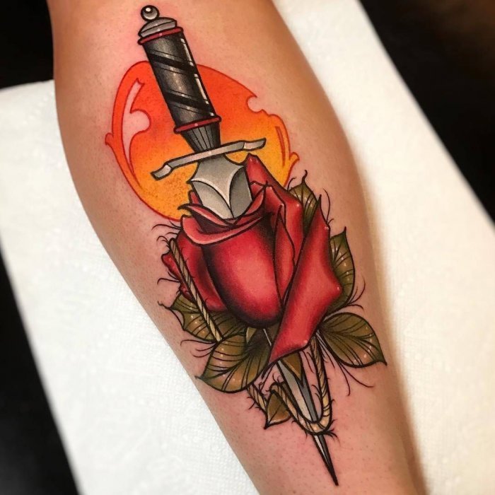 - Tradičné (Stará škola): V štýle tradičného tetovania ruží sa zvyčajne odohrávajú malebné svetlé farby, hrubé kontúry a živé detaily. Tento štýl je zvyčajne spojený s jasnými a nasýtenými obrázkami.